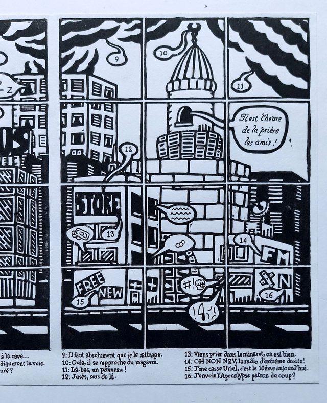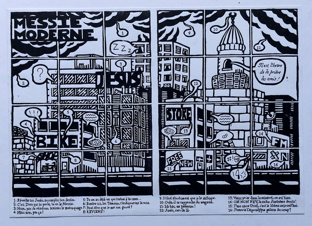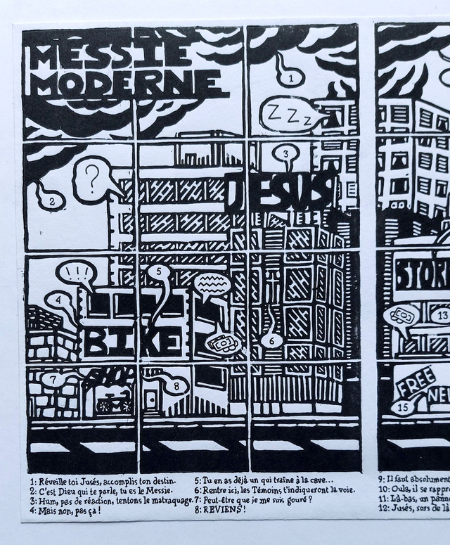 MESSIE MODERNE 21 cm x 29,7 cm, linogravure gravée et imprimée par Diogo Benedetti.