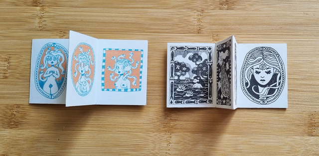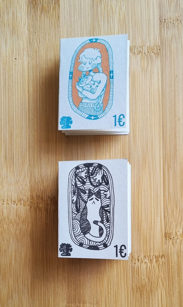 4,3 cm X 5,7 cm, deux mini-zines leporello, 6 pages chacun, noir & blanc & couleurs.