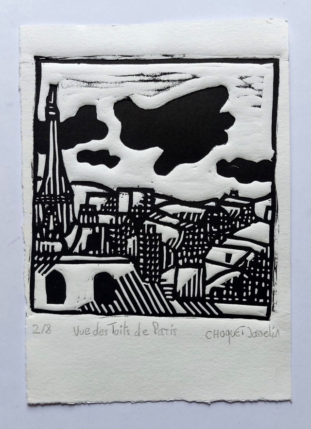 VUE DES TOITS DE PARIS 10,5 cm x 14,8 cm, linogravure gravée et imprimée par Josselin Choquet.